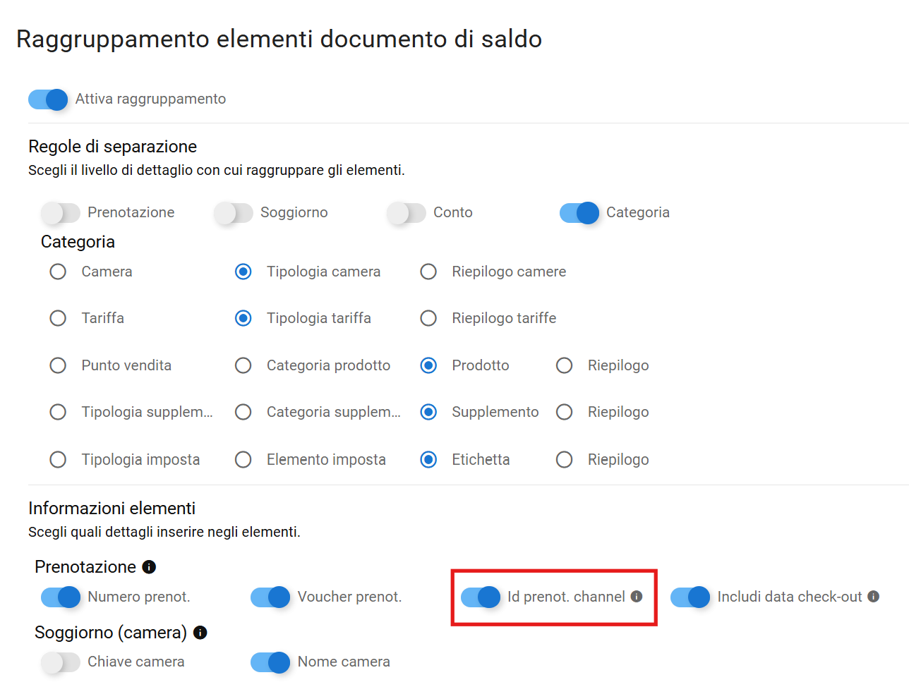 - impostarlo come predefinito per tutti i documenti. Vai in Impostazioni -> Sistema -> Fatturazione -> Raggruppamento elementi documento di saldo -> Informazioni elementi e attiva l'opzione ID prenotazione Channel manager