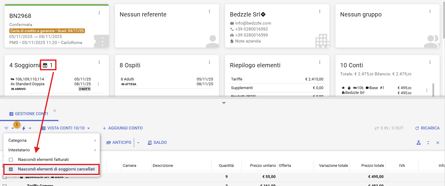 Se la prenotazione contiene più camere ed alcune di esse sono state cancellate, ora puoi nascondere gli elementi del conto associati a camere (soggiorni) cancellati
