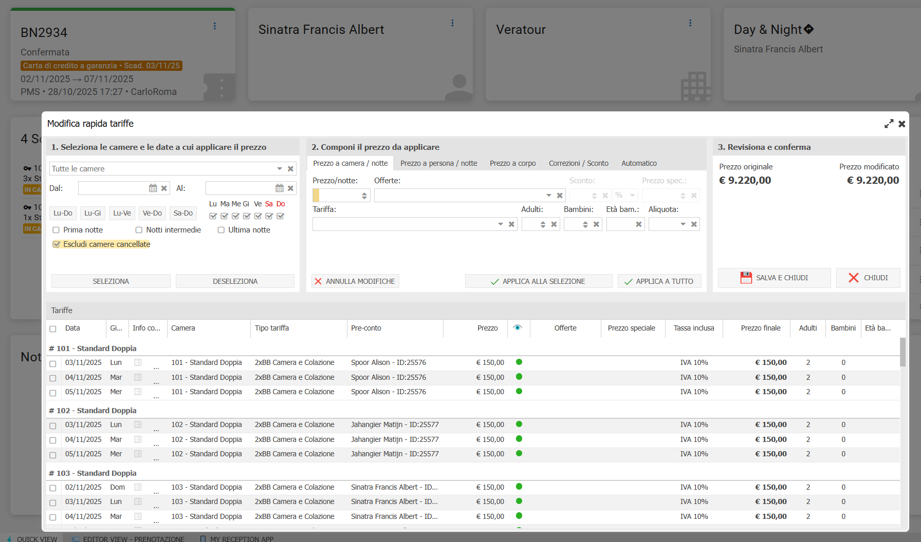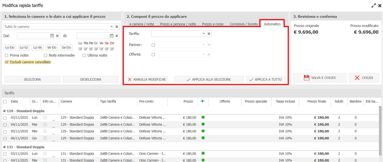 Abbiamo aggiunto la sezione Automatico che permette il calcolo dei prezzi, come già avviene durante l'inserimento della prenotazione, in base al listino, alla stagionalità e alle offerte attive. Inoltre è possibile modificare la tariffa, selezionare un listino partner o impostare offerte specifiche