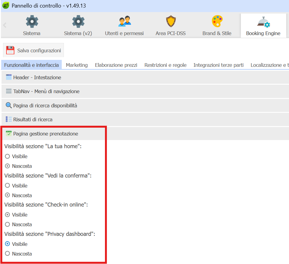 Ora è possibile personalizzare le sezioni per la gestione della prenotazione, presenti nel Booking Engine. Apri Pannello di Controllo -> Booking Engine e, nella sezione Pagina gestione prenotazione, imposta la visibilità delle sezioni come desideri