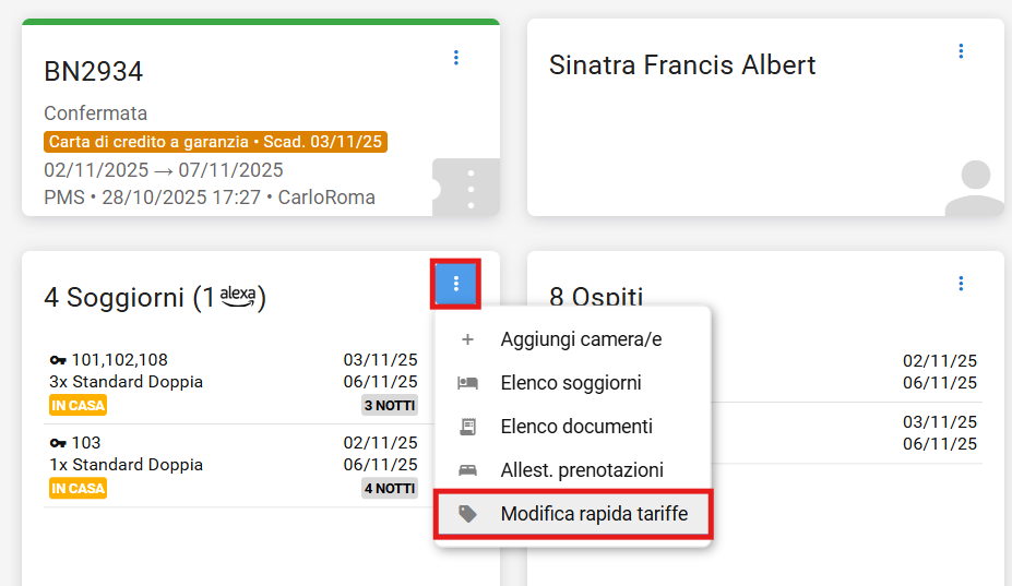 Abbiamo aggiunto il link alla funzione Modifica rapida tariffe nelle opzioni della card Soggiorni