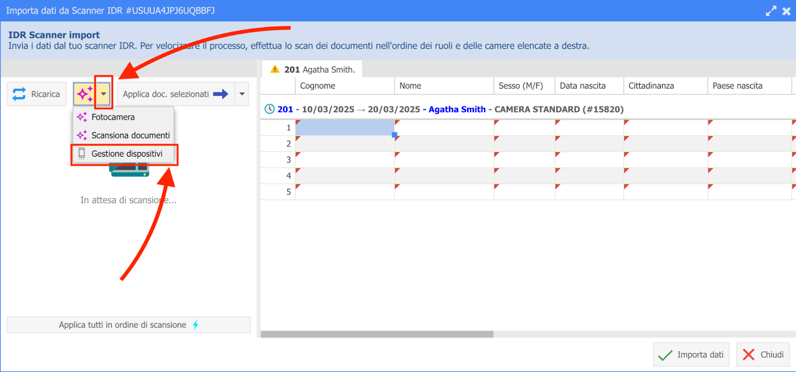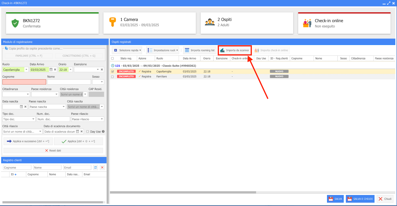 Nel modulo "Registrazione ospiti", clicca "Importa da scanner"