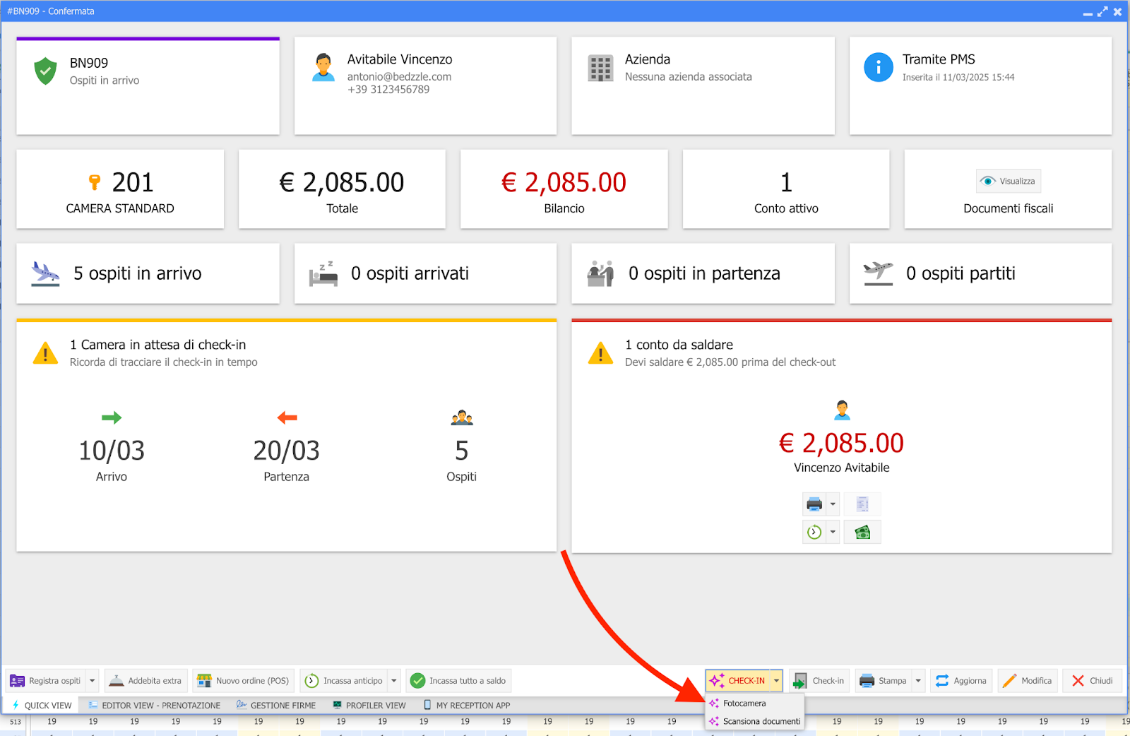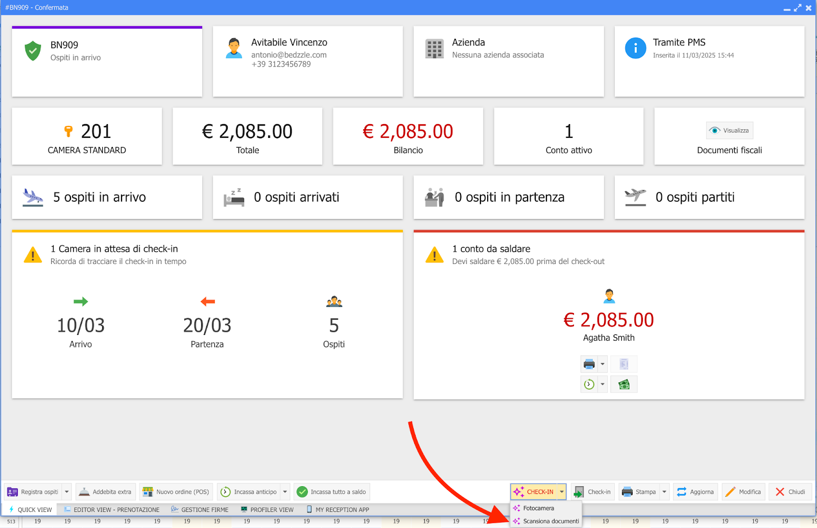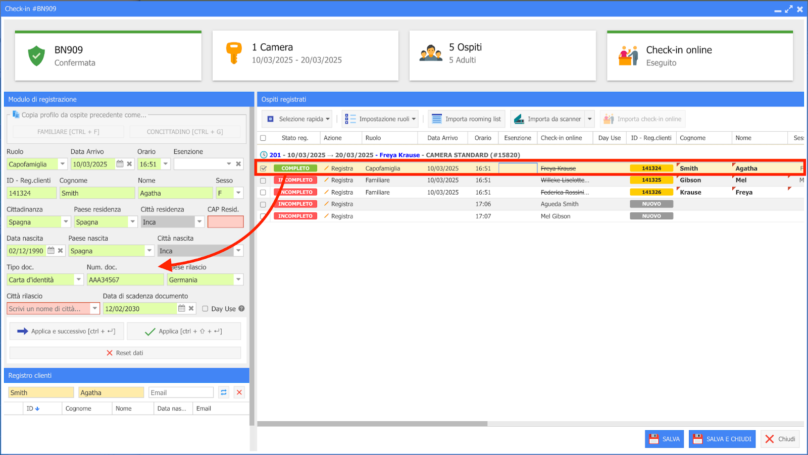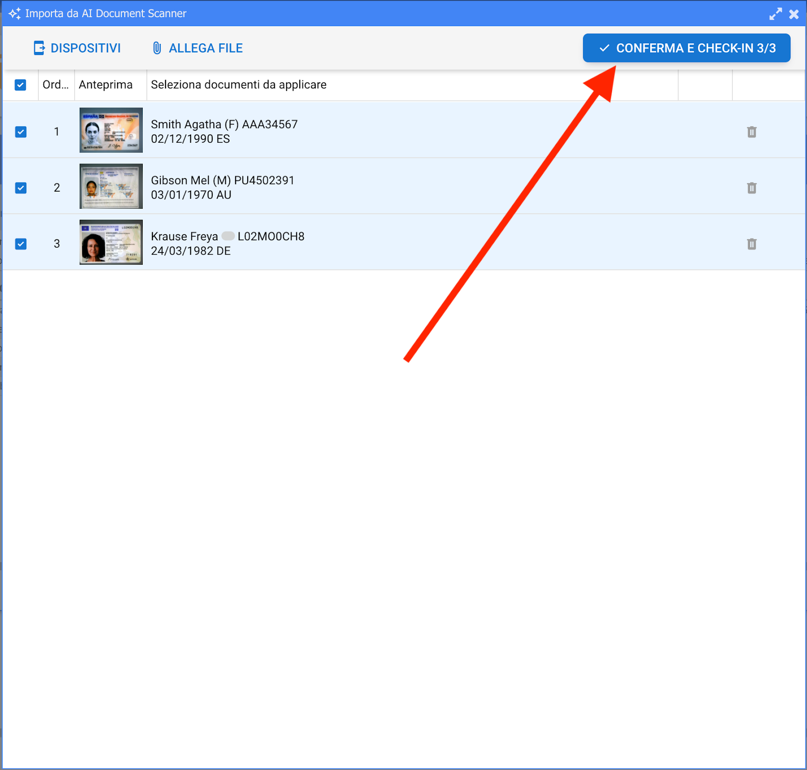 Una volta visualizzati i documenti acquisiti nel PMS, clicca su "CONFERMA E CHECK-IN" per trasferire i dati nel modulo "Registrazione ospiti" ed effettuare il check-in.
