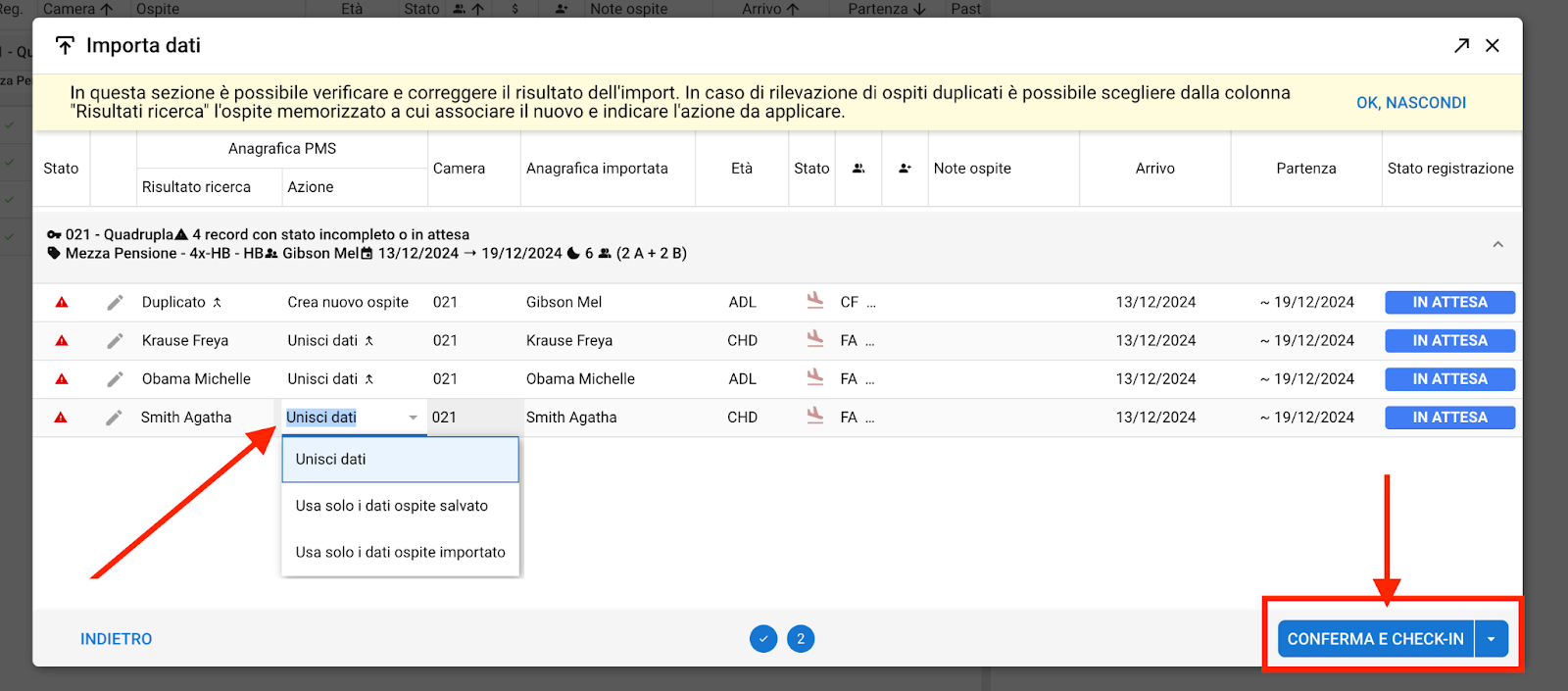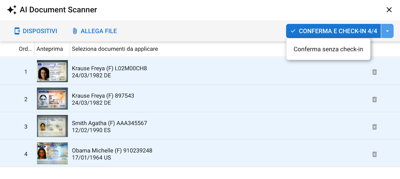 Una volta visualizzati i documenti acquisiti nel PMS, clicca su "CONFERMA E CHECK-IN" per trasferire i dati nel modulo "Registrazione ospiti" ed effettuare il check-in, oppure su "Conferma senza check-in".