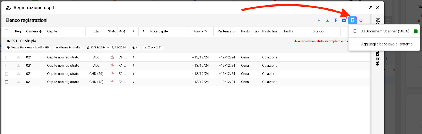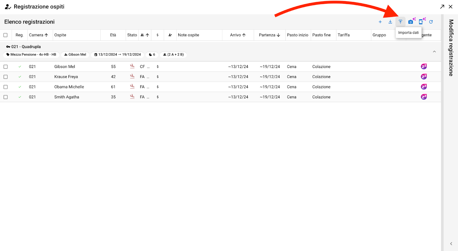 Dalla maschera "Registrazione ospiti", clicca sul tasto Importa dati