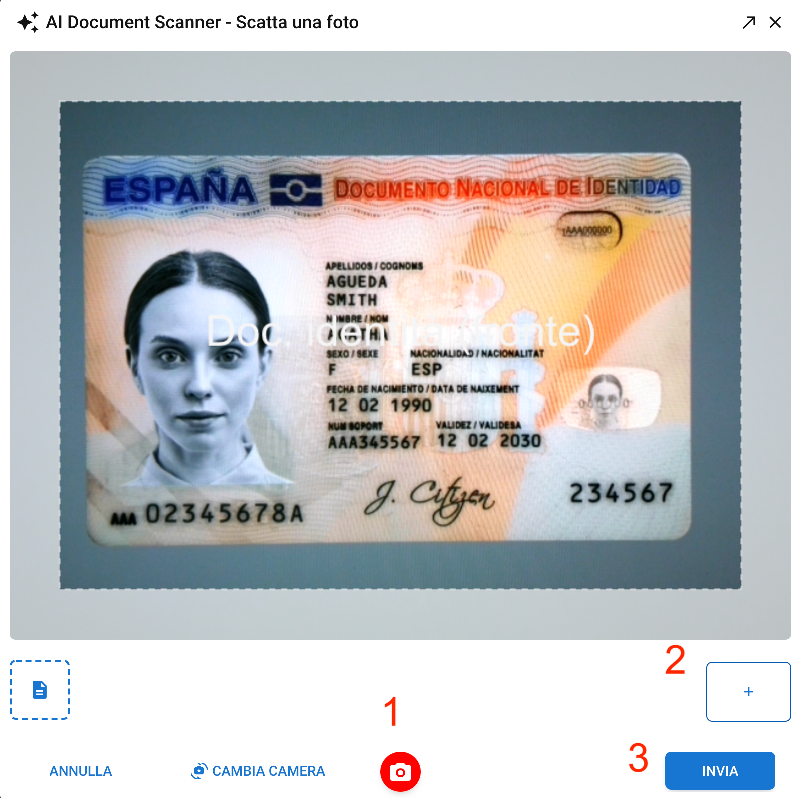 | ● Clicca sul tasto "Fotocamera" per scattare una prima foto al documento (fronte) e poi una seconda foto (retro), se necessario.