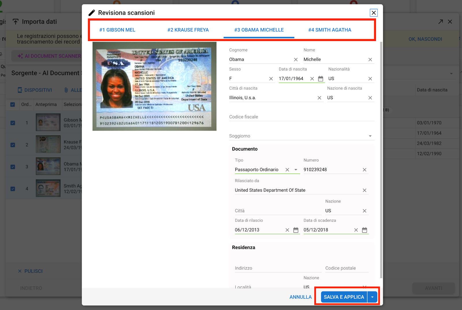 Controlla le scansioni dei documenti selezionandole dalle schede in alto e clicca su "SALVA E APPLICA".