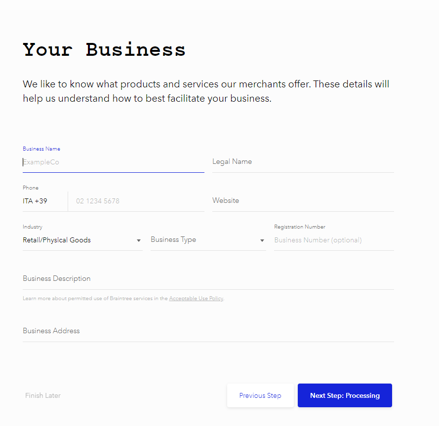 Invio documentazione legaleRicorda che dopo aver eseguito i precedenti passaggi, Braintree ti contatterà via email chiedendoti alcuni documenti sulla tua società per validare il tuo account e renderlo operativo al 100%. In genere dovrai inviare: