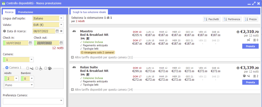 È possibile stabilire l'ordinamento delle camere che vengono visualizzate in fase di ricerca nel Booking Engine. Nella sezione Pannello di controllo -- > Booking Engine --> Elaborazione prezzi --> Ordinamento risultati troviamo le opzioni possibili. ...