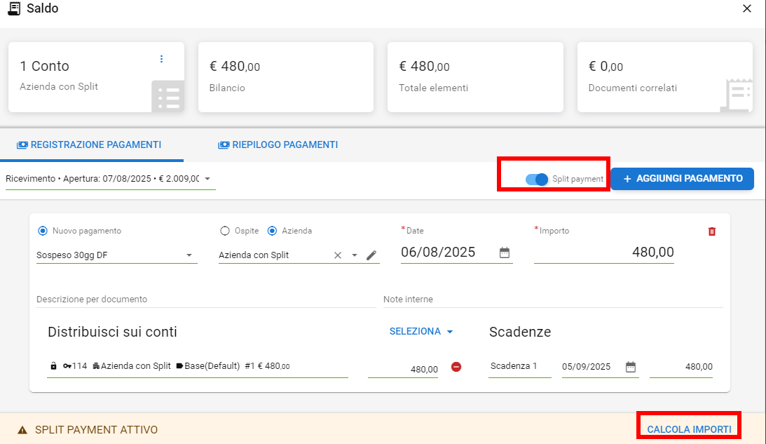 Selezionando uno o più conti associati a prenotazioni dell’azienda con un Profilo Business abilitato allo Split Payment e cliccando su “SALDO”, si apre la maschera dei pagamenti indicando lo Split Payment configurato. Cliccare su Calcola Importi per splittare il pagamento in automatico: