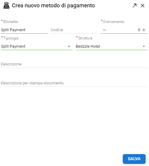 Selezionare Split Payment come tipologia, inserire poi un etichetta (nome del pagamento) a piacere e un codice per ordinarne la visualizzazione e Salva.