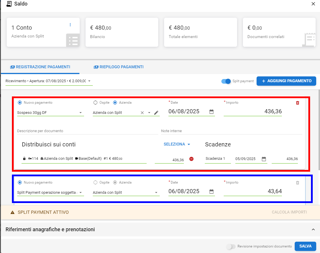 - nel secondo riquadro (in blu, non modificabile) è presente il valore dell’imposta con metodo di pagamento Split Payment, creato in precedenza