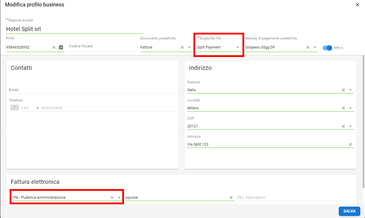 Impostazione del Profilo BusinessCrea o modifica il profilo aziendale collegato all’Ente/Azienda in Split Payment selezionando, nel campo “