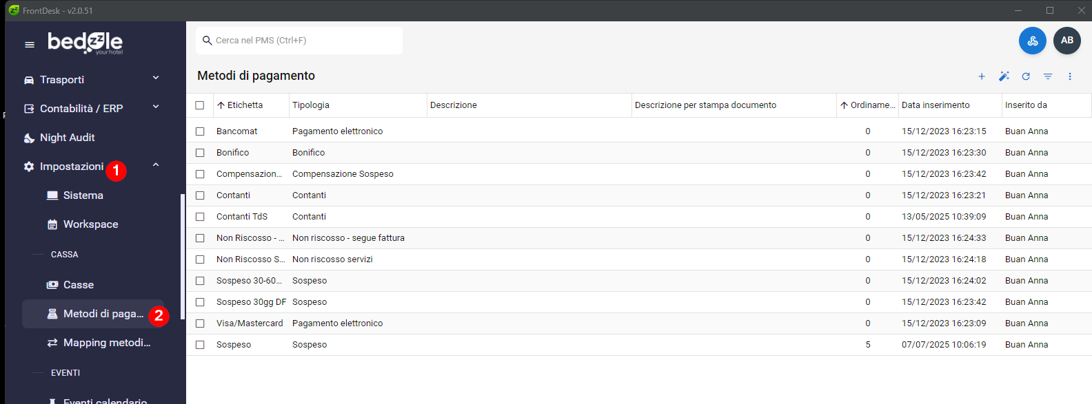 Dal menu Front Desk V2 - Sistema aprire Metodi di Pagamento.