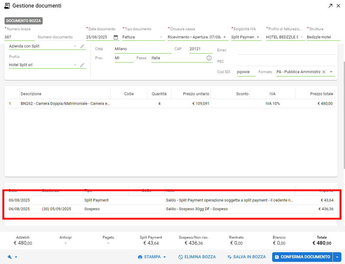 Cliccando su “Salva” si procede con la generazione del documento (impostato come “Fattura” e non modificabile) che riporta, nelle righe dei pagamenti, gli importi di imponibile e imposta suddivisi in 2 o più righe e, nei totali a piè di pagina, il totale documento e l’indicazione dell’importo dell’imposta nell'apposita sezione Split Payment: