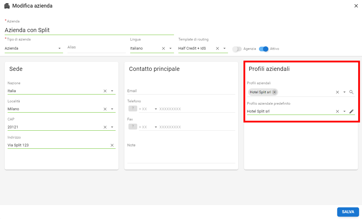 Entra nell'anagrafica Azienda ed associa il Profilo Business con Split Payment nel campo Profilo aziendale predefinito se non associato in precedenza