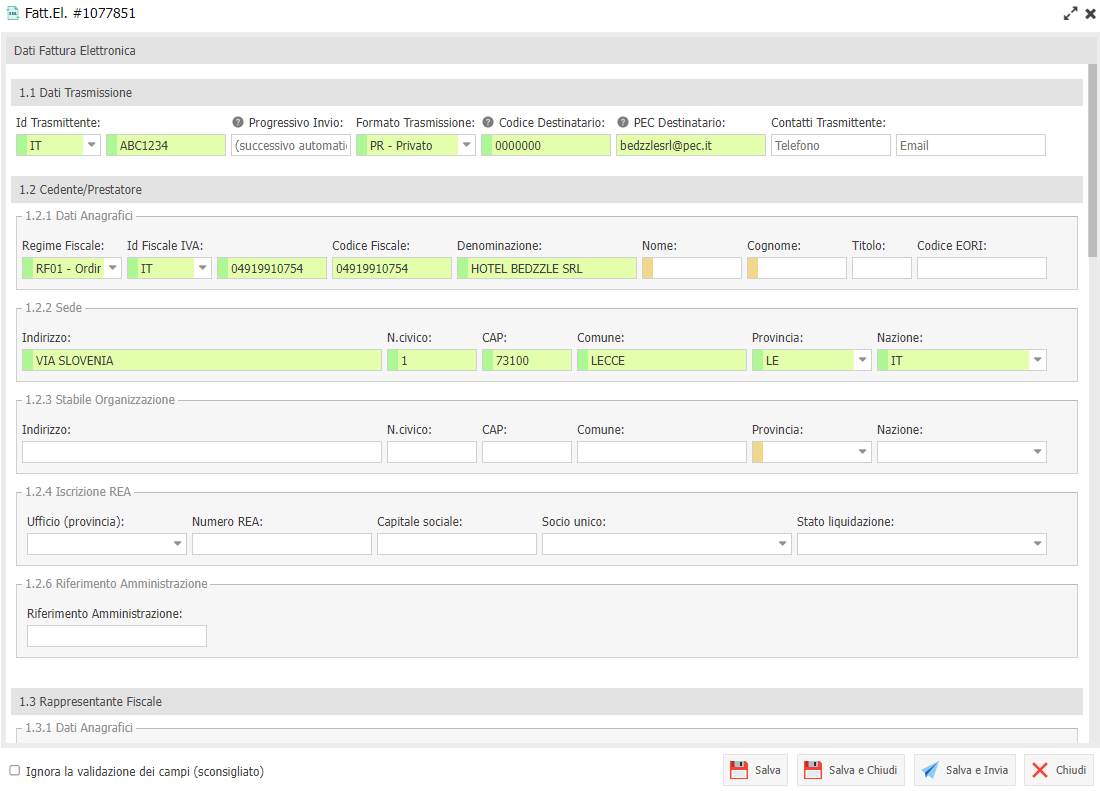 Salva e Invia per per effettuare l'invio della fattura al SDI (disponibile per chi utilizza Digital Hub di Zuchetti).