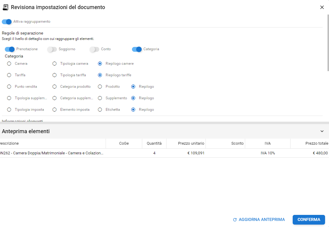 Una volta confermato il raggruppamento, verrà aperto il documento, in stato Bozza, pronto per essere revisionato ed emesso.