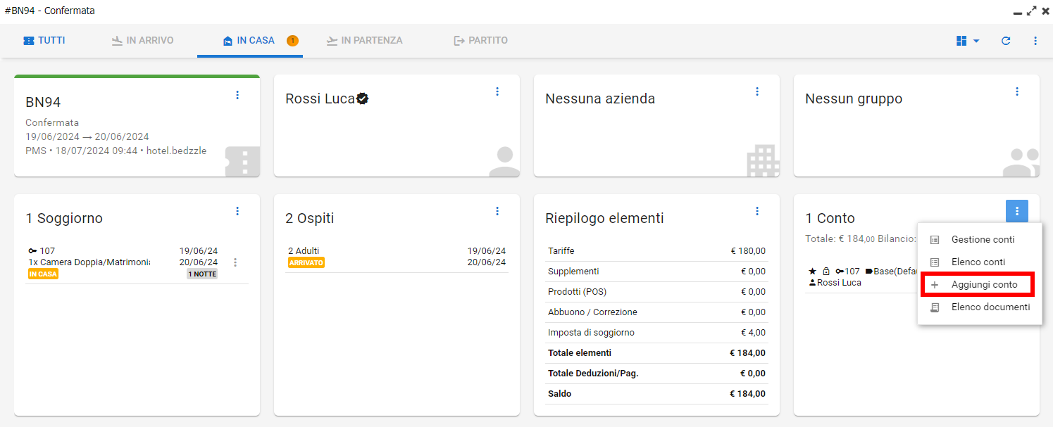 Se la prenotazione è già stata registrata e checkinata, nella sezione Ospite saranno presenti le anagrafiche registrate. In questo modo, sarà possibile aprire in pochissimi secondi un conto intestato ad esempio ad uno degli altri ospiti occupanti la camera.