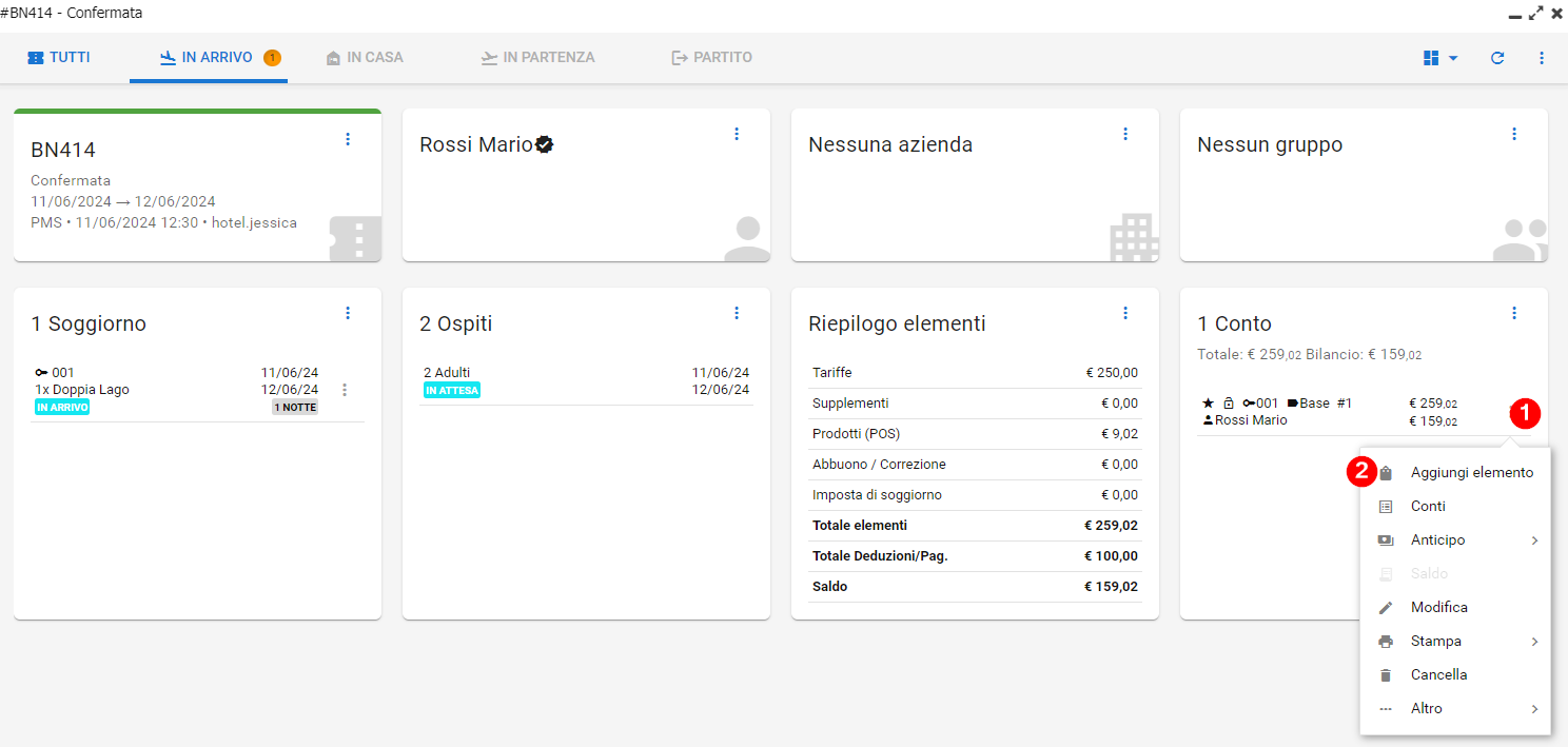 Dalla card Conti, utilizzando la funzione Aggiungi Elemento, selezionare il supplemento Costo per No Show ed impostarne l'importo da addebitare: