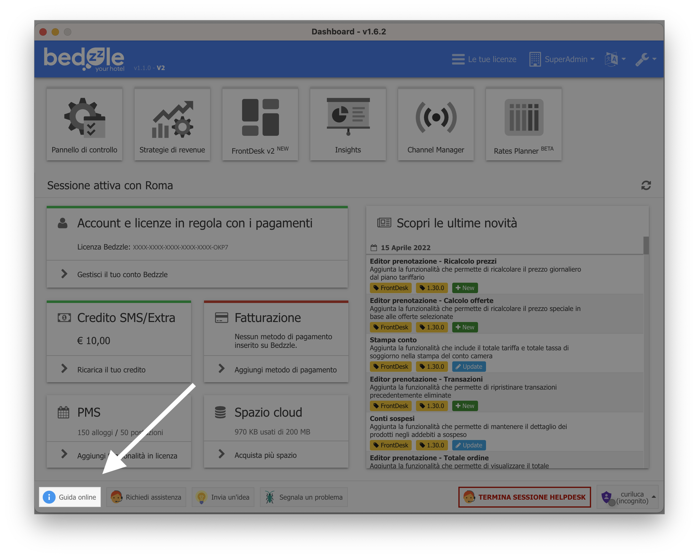 Per accedere alla Guida Online direttamente dal tuo Bedzzle clicca dalla Dashboard il tasto "Guida"