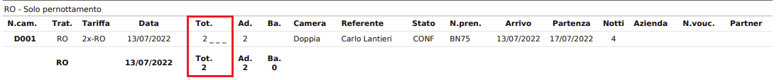 Il giorno 12/07 troveremo quindi 3 camere (già in casa) e nella sezione Tot. viene indicato quali pasti sono previsti (C = colazione, P1 = Pasto1, P2 = Pasto2)