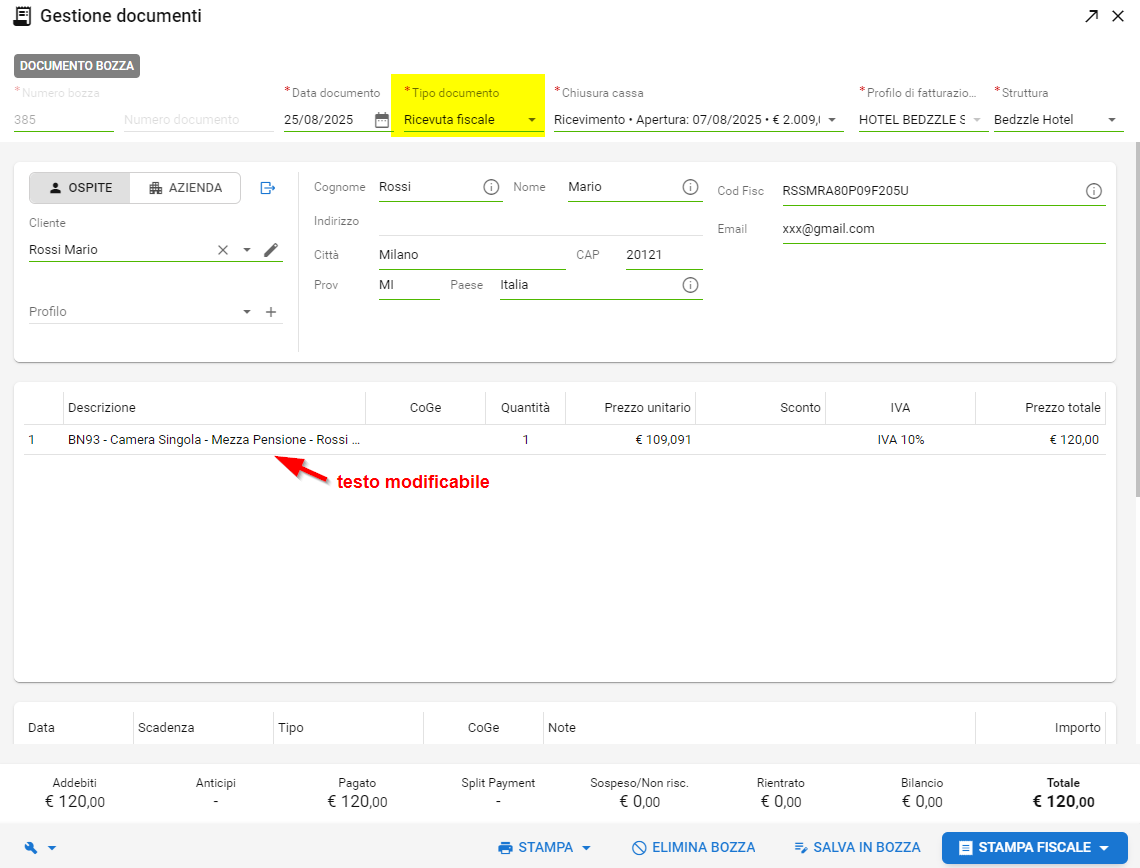 Una volta confermato il raggruppamento, verrà aperto il documento Ricevuta Fiscale, in stato Bozza, pronto per essere revisionato ed emesso.