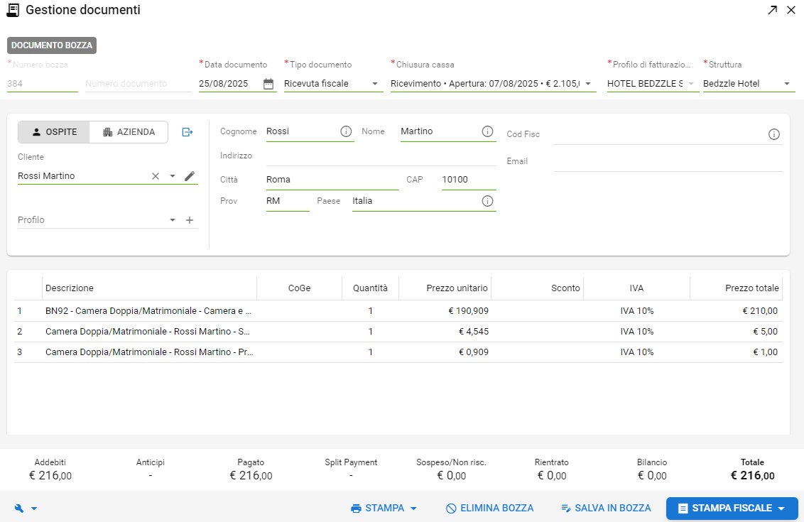 Saldo, impostando il metodo di pagamento desiderato, e la generazione del relativo documento.