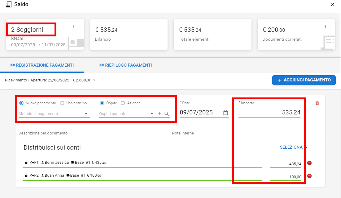 Verrà proposto un unico pagamento, per il quale andrà selezionato il metodo utilizzato (il pagamento è divisibile in più tranche con metodi diversi tramite la funzione "Aggiungi Pagamento") e l'ospite pagante tra quelli selezionati, e si potrà procedere con la generazione del documento: