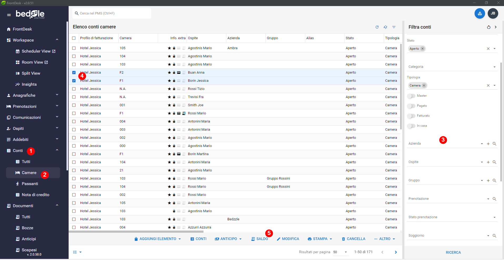 Accedere alla maschera Conti - Camere, tramite il Filtro sulla destra possono essere filtrati i vari conti sulla base di molteplici Filtri (ospite, camera, date di soggiorno..)