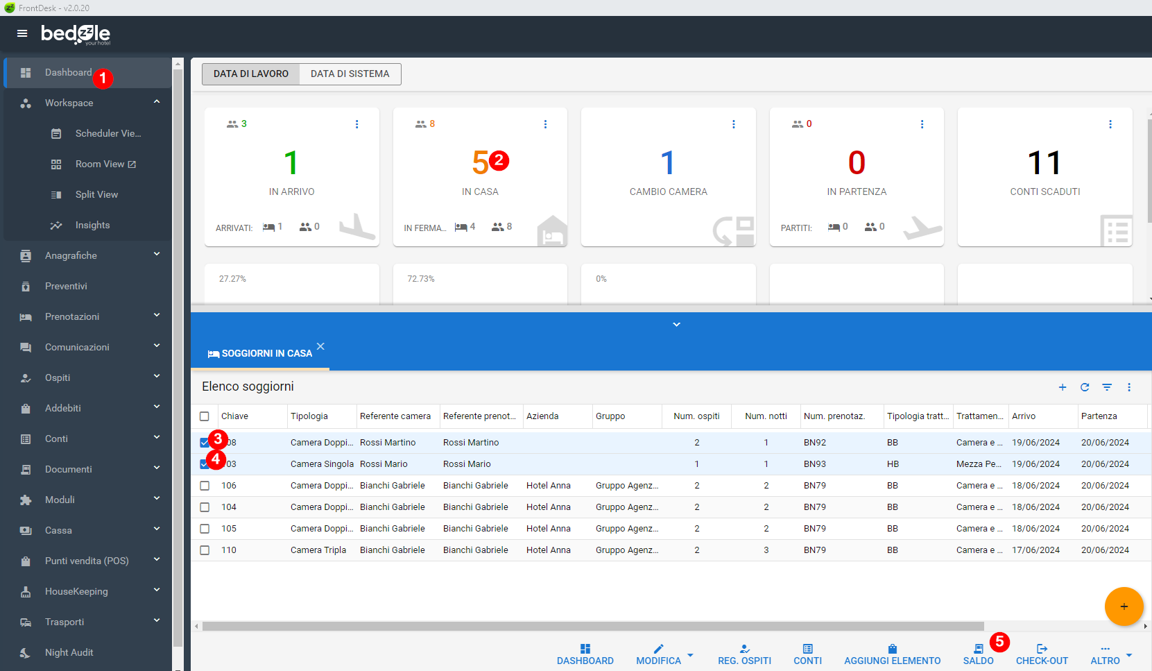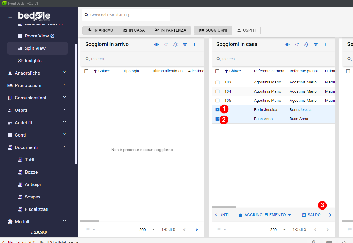 Se i soggiorni sono nello stesso Stato (es. tutti in casa o tutti in partenza) sarà sufficiente selezionare i Soggiorni interessati prima e l'opzione Saldo poi:
